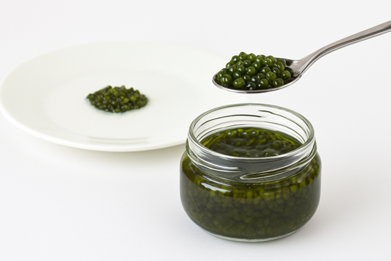 Caviar marino vegano: Esferas texturizadas de espirulina. Experiencia gastronómica premium para alta cocina.